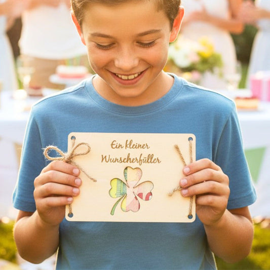 Geldgeschenk – „Kleiner Wunscherfüller“ Holzkarte mit Kleeblatt