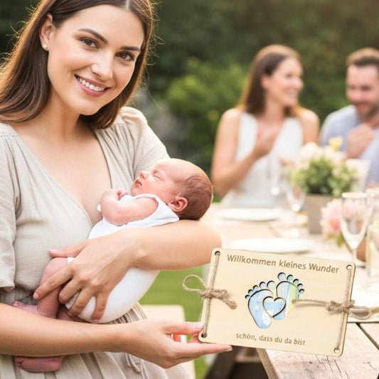 Geldgeschenk zur Geburt – „Willkommen kleines Wunder“ Holzkarte mit Füßen